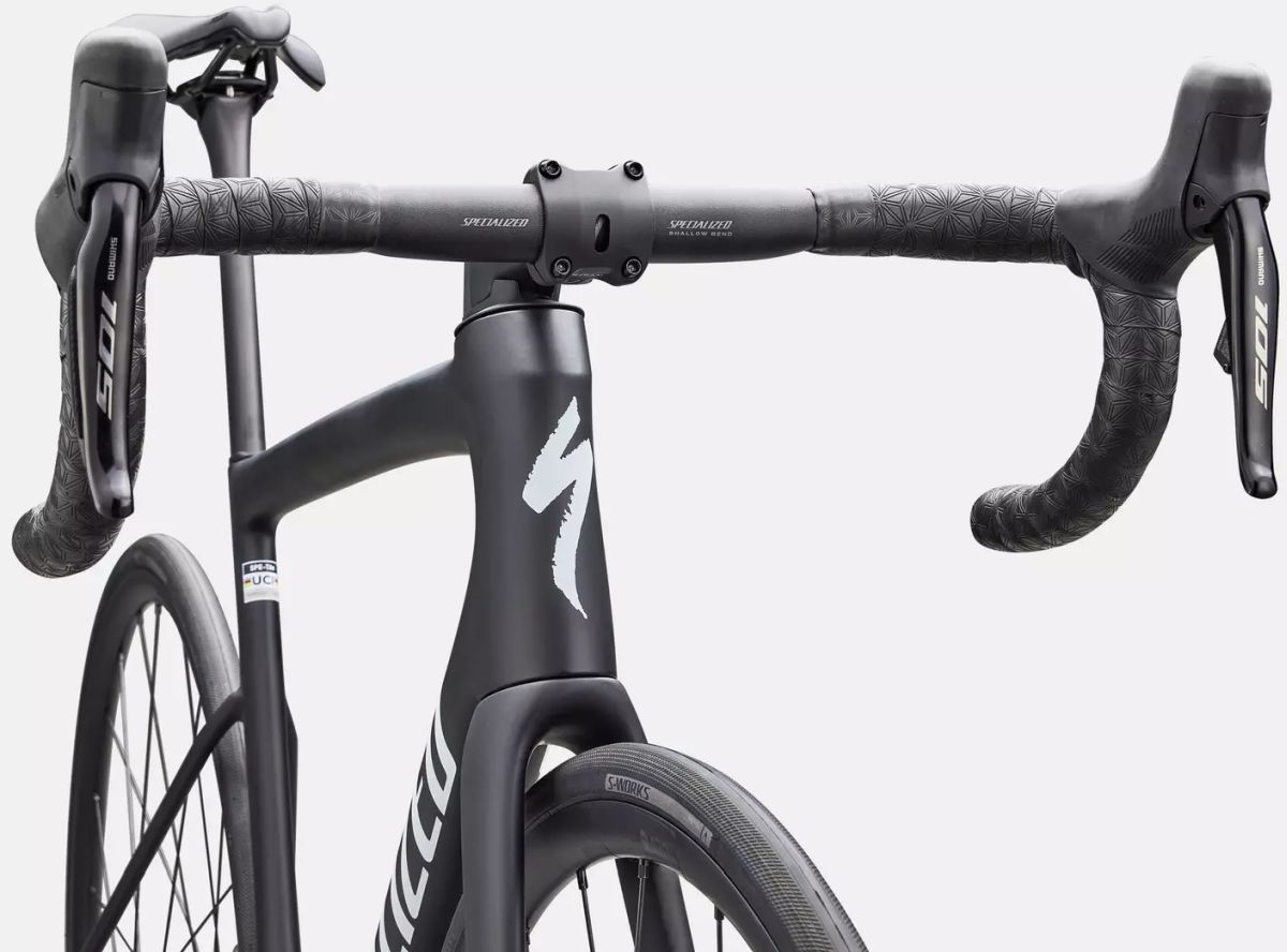 Especificaciones TecnicasCuadro: Tarmac SL8 FACT 10r Carbon, Rider First Engineered, cableado interno, 12x142mm thru-axle. Horquilla: FACT 10r Carbon, 12x100mm thru-axle, flat-mount disc. Transmision: Shimano 105 Di2 R7150, 12 velocidades (Platos 52/36t, Piñon 11-34t). Frenos: Shimano 105, disco hidraulico. Neumaticos: S-Works Turbo, 120 TPI, proteccion BlackBelt, 700x26mm. Sillin: Body Geometry Power Sport. Poste de sillin: S-Works Tarmac SL8 Carbon, FACT Carbon, 15mm offset. Peso aproximado: 7.68 kg (Talla 56).