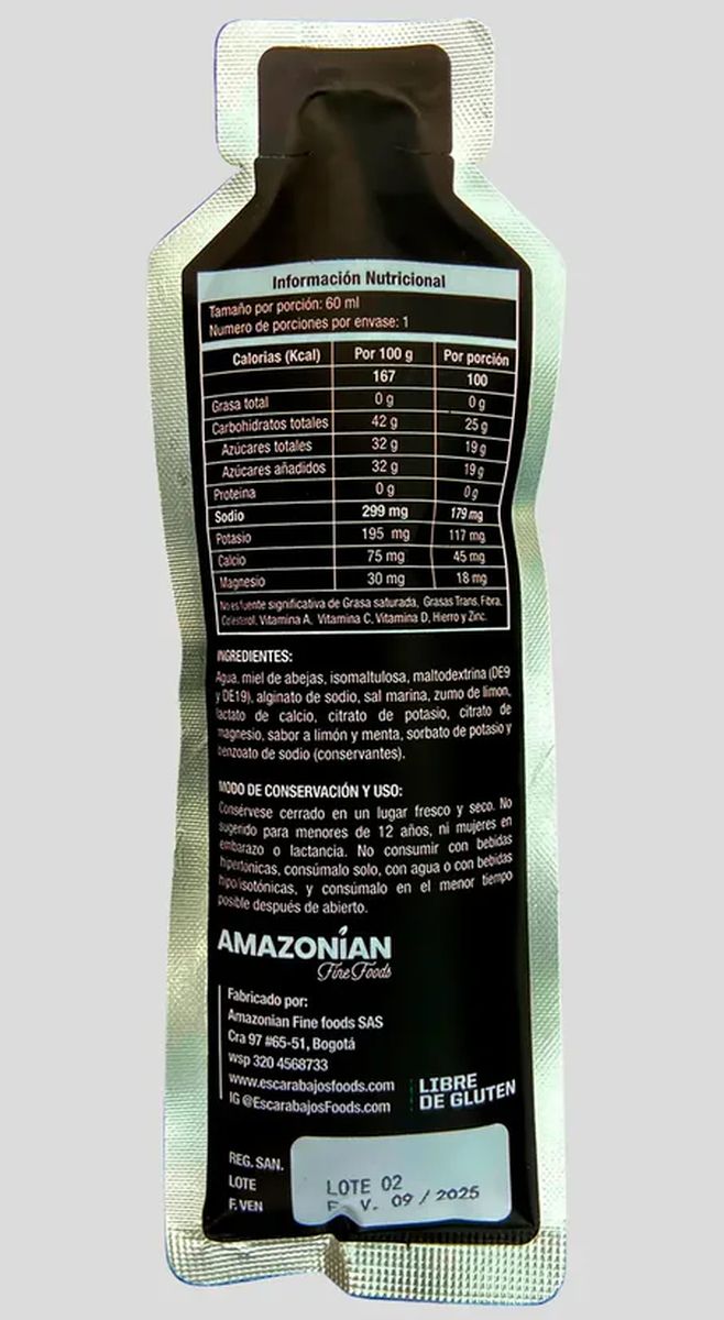 Un gel cuya **innovadora fuente y combinación planificada de carbohidratos** (25g CHO con ratio 1:07 glucosa:fructosa) a base de miel de abejas, isomaltulosa, maltodextrinas DE9 y DE20, y una óptima matriz de **electrolitos de rehidratación** (sal marina, citrato de potasio y de magnesio) por sudoración deportiva (no vómito, diarrea, resaca, etc.), junto a su textura gelificada de manera exclusiva y en primicia en Colombia por alginato de sodio, hacen de este gel un producto ideal para deportistas.